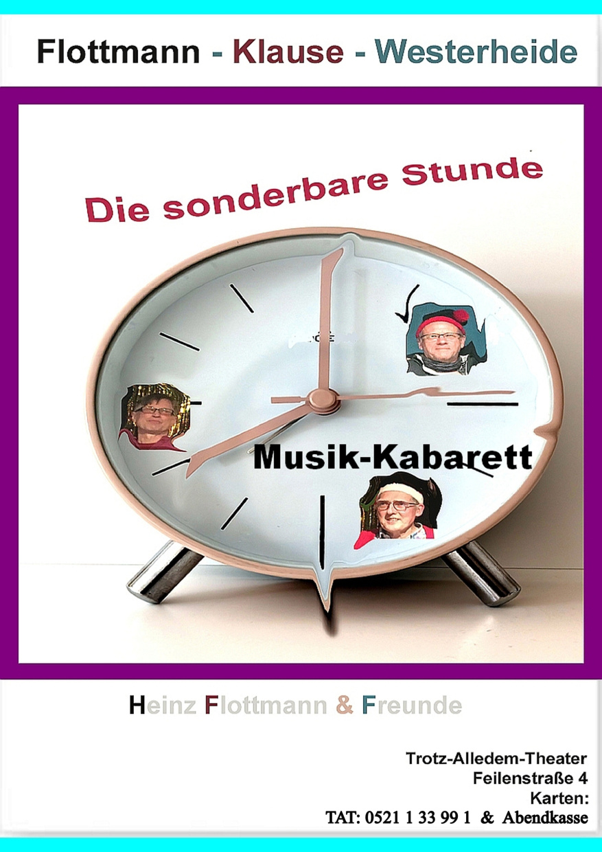 Am Ende stellt man fest, dass die Uhren bei Heinz vielleicht etwas anders ticken. Aber so ist Herr Flottmann eben – Zeit verläuft auch nicht immer linear. Seit 25 Jahren stemmt sich Heinz Flottmann entschieden gegen den Mainstream. Nun zieht er ein erstes Resümee. Ein musikalisches Programm der leisen Töne in dieser unseren lauten Zeit. Feinsinnig absurd, herzhaft geschmeidig, naheliegend weitläufig. Immer hart am Beat des dritten Jahrtausends vorbei. Heinz und die instrumentalen Fachkräfte der Spitzenklasse Matthias Klause und Reinhold Westerheide präsentieren ein musikalisches Tiramisu aus unglaublichen Geschichten und ein paar der Songs, die ihre größten Hits hätten werden können. Vorsicht, das könnte lustig werden.