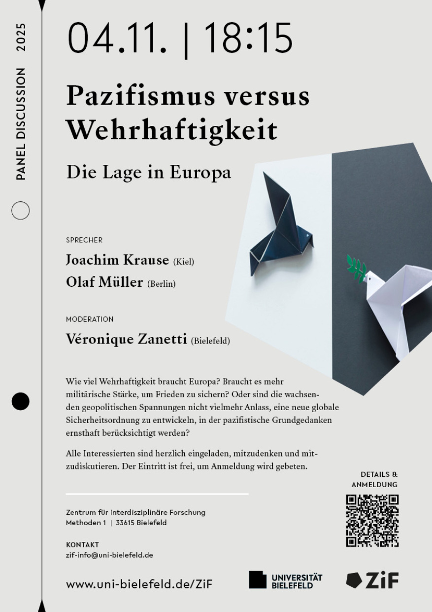In dieser Veranstaltung diskutieren Prof. Dr. Olaf Müller (Humboldt-Universität Berlin) und Prof. Dr. Joachim Krause (ehemaliger Leiter des Sicherheitsinstituts Kiel) über die Herausforderungen und Perspektiven für Europa – zwischen der Notwendigkeit von Wehrhaftigkeit und dem Anspruch, Konflikte friedlich und diplomatisch zu lösen. Die Philosophin Prof. Dr. Véronique Zanetti wird den Abend moderieren.