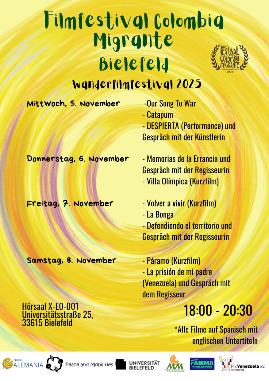 Vom MSCA-Horizon-Projekt „Peace and Mobilities“ freuen wir uns, Sie zum Colombia Migrante Filmfestival (Gastland: Venezuela) – Wanderausstellung 2025 einzuladen, das vom 5. bis 8. November im Raum X-E0-001 der Universität Bielefeld von 18:00 bis 20:30 Uhr stattfindet. Während des Festivals werden Kurz- und Spielfilme zu Migration und Exil sowie Werke von Migranten gezeigt. Zudem wird es Gespräche mit einigen der Regisseurinnen und Regisseure geben.
