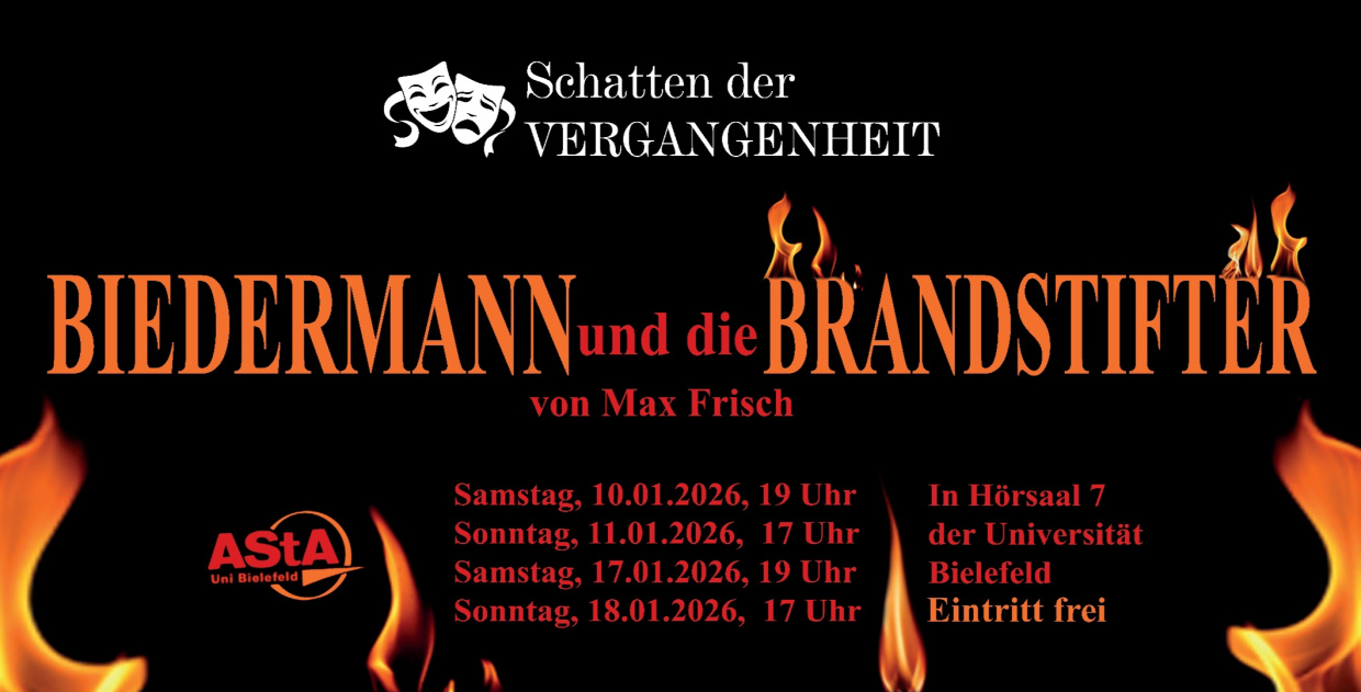 Die Theatergruppe Schatten der Vergangenheit bringt ihr sechstes Stück auf die Bühne des Hochschultheaters: „Biedermann und die Brandstifter“ von Max Frisch. An insgesamt vier Terminen sind im Hörsaal 7 der Universität Bielefeld zwei Besetzungen zu sehen.