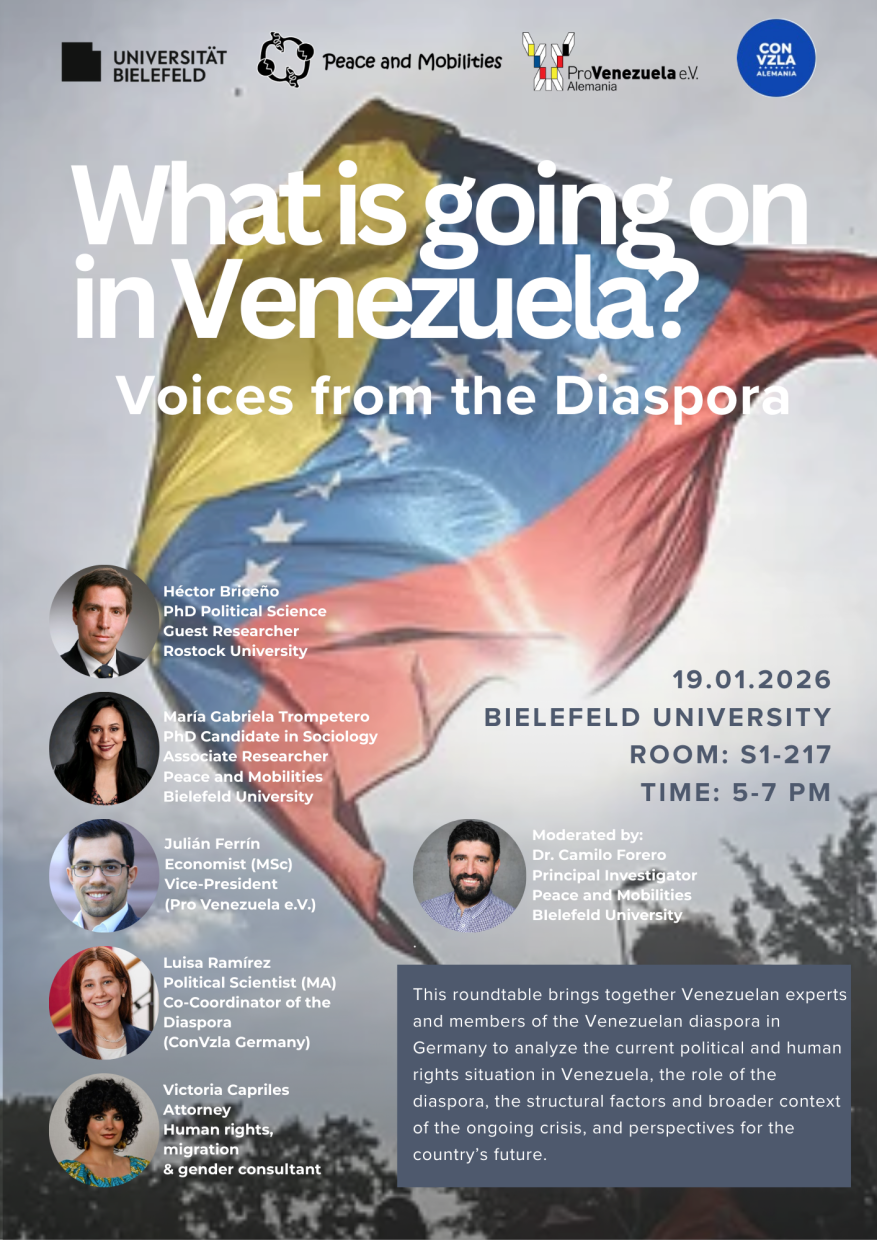 The MSCA „Peace and Mobility“ project, Bielefeld University, invites you to the roundtable „What Is Going On in Venezuela? Voices from the Diaspora.“