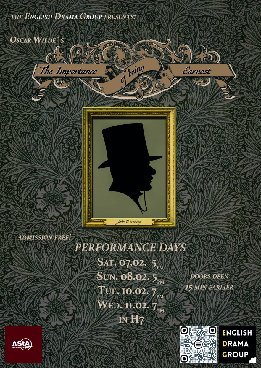 Die English Drama Group lädt euch herzlich zu einem trivialen Abend für ernste Menschen ein. Kommt mit ins viktorianische England, wo die beiden Junggesellen Algernon und Jack ihr Bestes geben, die gesellschaftlichen Traditionen und Erwartungen kreativ zu umgehen. Doch sich mit erfundenen Personen herauszureden und sich als ein Mann namens Ernest auszugeben, erweist sich eher als Hindernis statt Hilfe. Während sie sich um die Frauen, die sie lieben, bemühen, entdecken sie schnell die Fallstricke, die ein Doppelleben mit sich bringt.