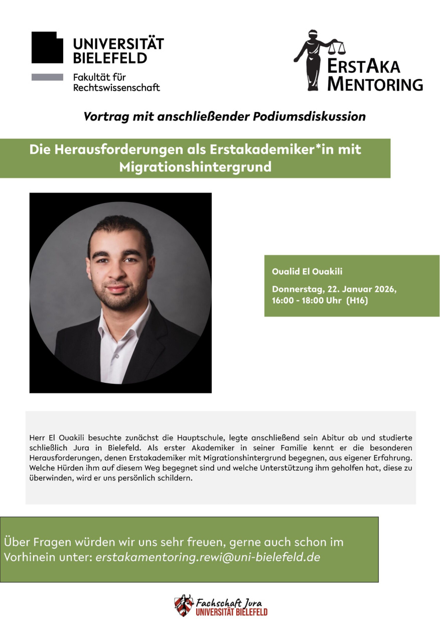 Herr El Ouakili besuchte zunächst die Hauptschule, legte anschließend sein Abitur ab und studierte schließlich Jura in Bielefeld. Als erster Akademiker in seiner Familie kennt er die besonderen Herausforderungen, denen Erstakademiker*Innen mit Migrationshintergrund begegnen, aus eigener Erfahrung. Welche Hürden ihm auf diesem weg begegnet sind und welche Unterstützung ihm geholfen hat, diese zu überwinden, wird er uns persönlich schildern.